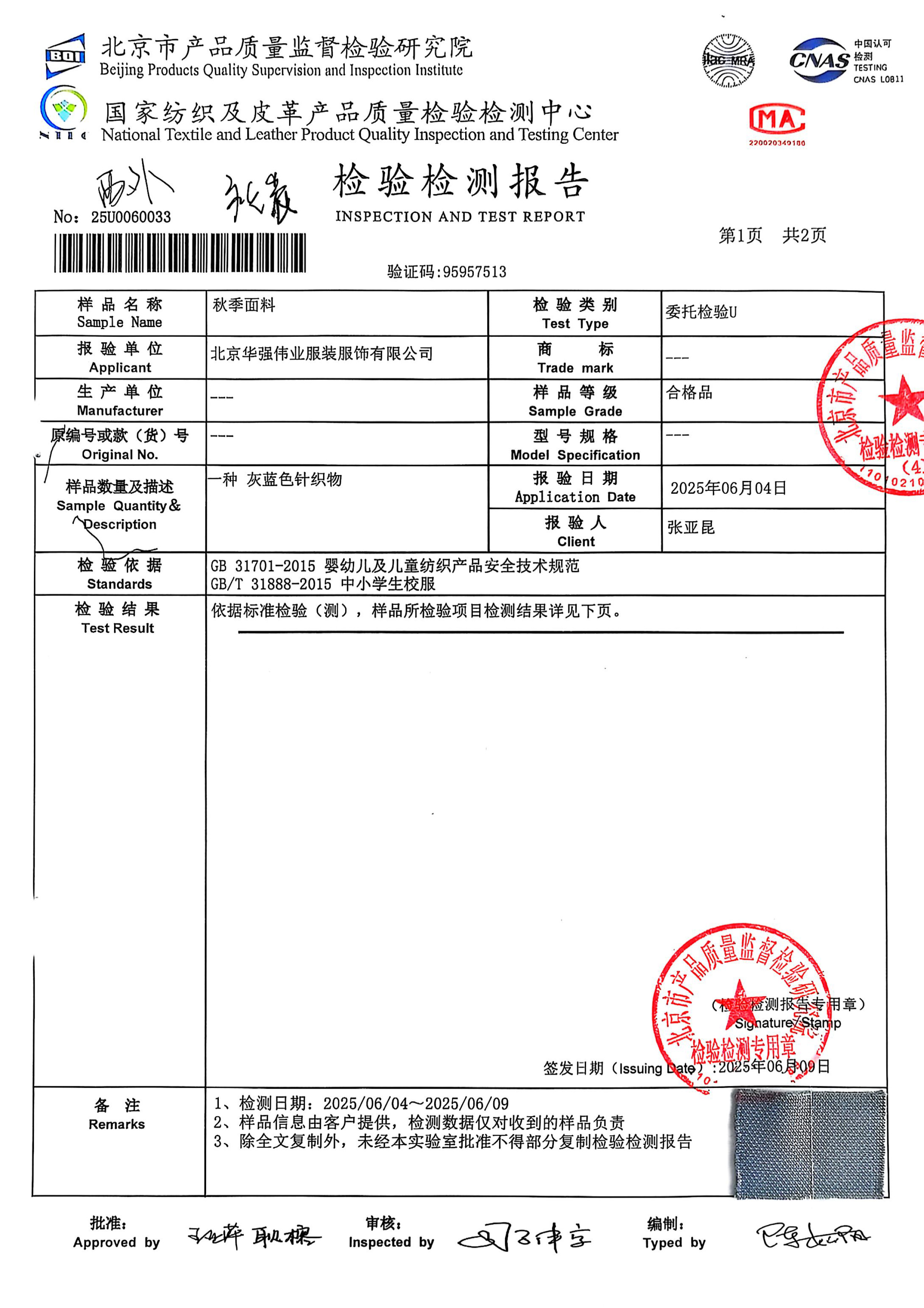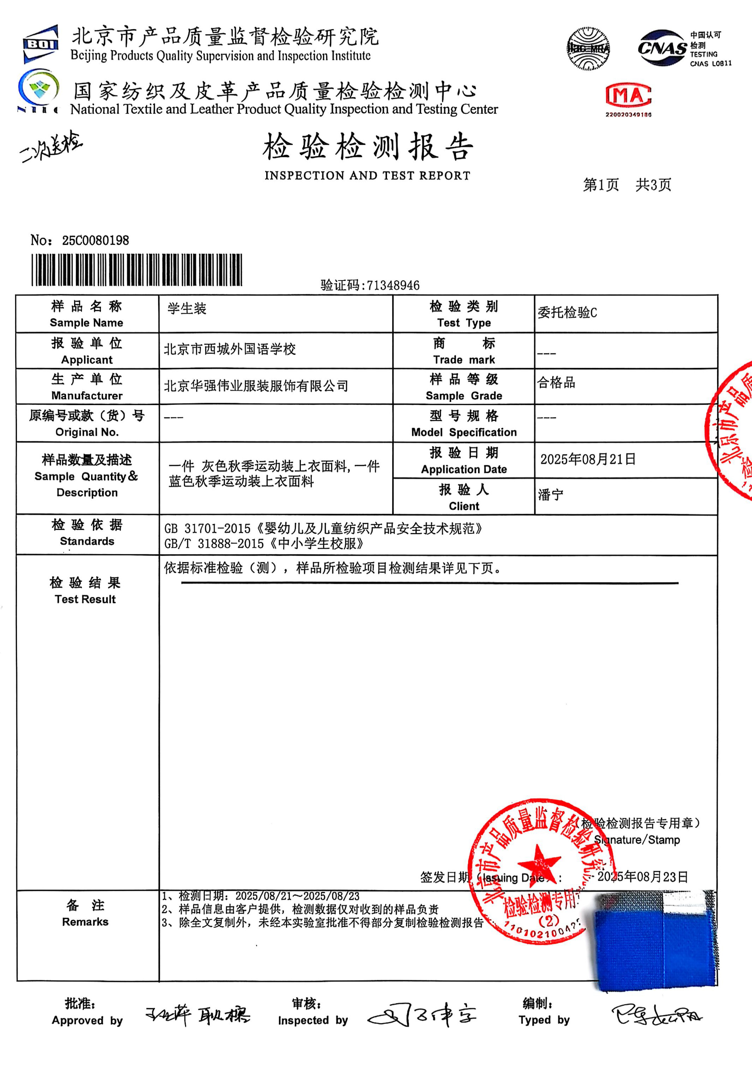 2025新生校服学校二次送检检测报告