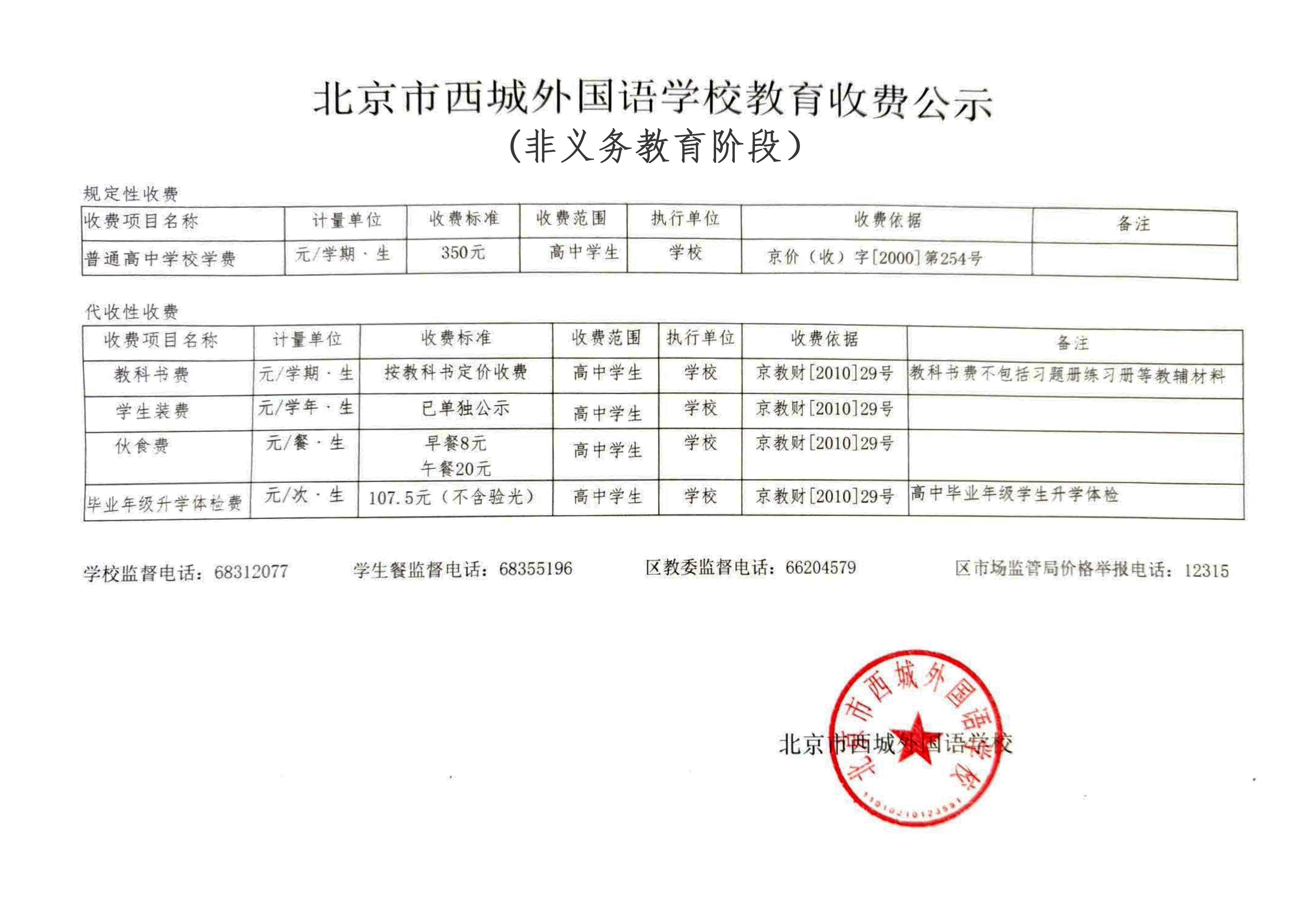 北京市西城外国语学校教育收费公示(非义务教育阶段)