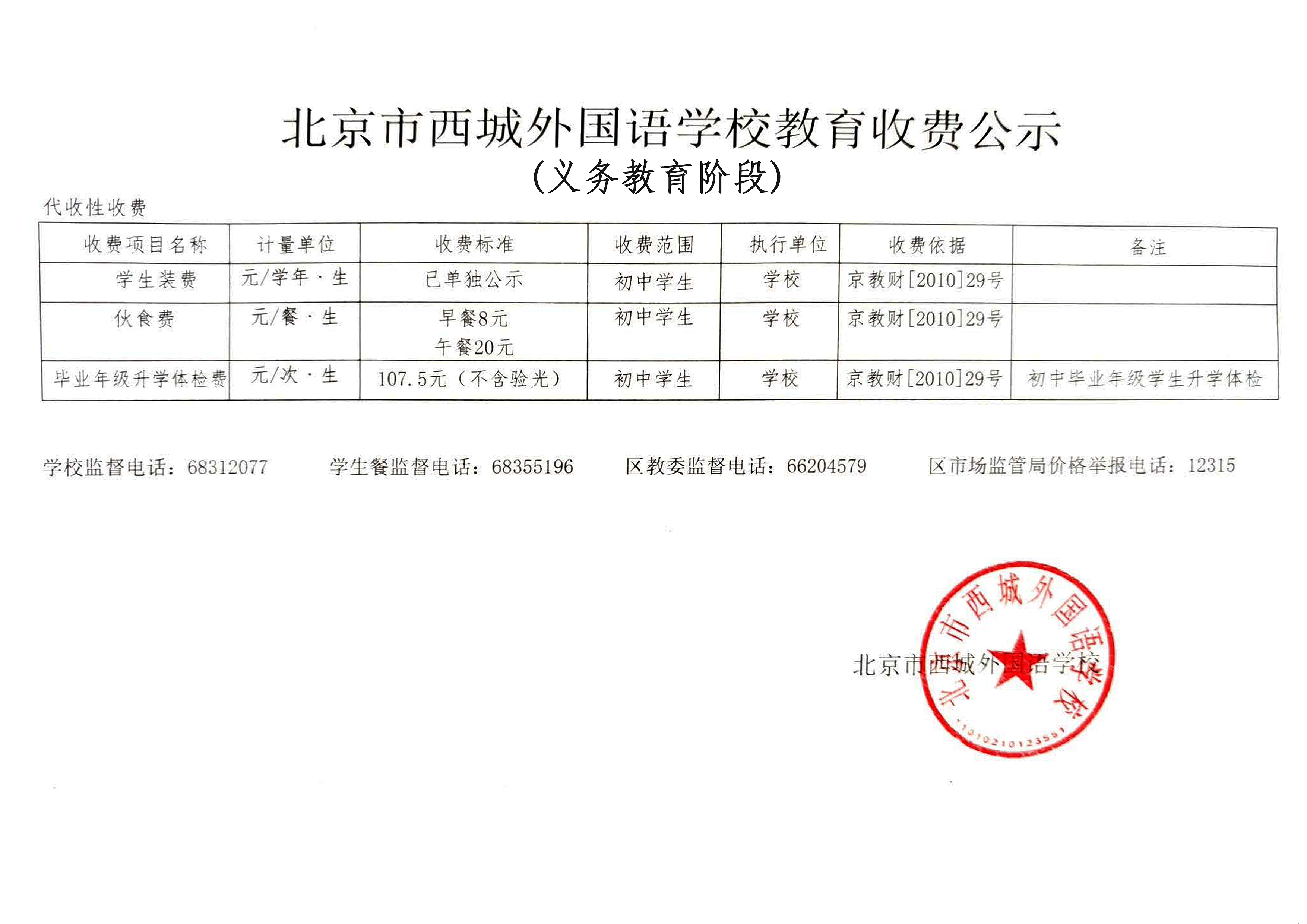 北京市西城外国语学校教育收费公示(义务教育阶段)